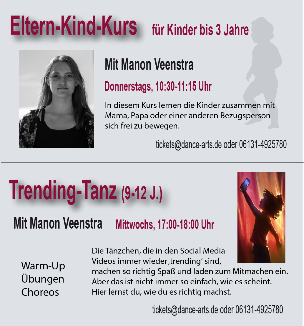 Eltern-Kind Kurs, mit Manon Veenstra. In diesem Kurs lernen die Kinder zusammen mit Mama, Papa oder einer anderen Bezugsperson sich frei zu bewegen. Rhythmusgefühl, Koordination und Musikalität werden in einfachen Spielen entwickelt und gefördert, ohne Zwang und mit viel Spaß.