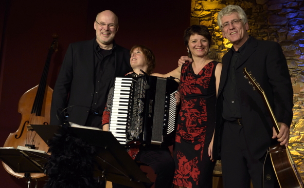 Wir freuen uns, Rouge Baiser wieder in unserer Kulturschiene begrüßen zu können, sodass Brigitte Stortz-Schindler (Gesang), Bettina Pahle (Akkordeon), Harry Reeh (Gitarre und Mandoline) und Bernhard Fuchs (Kontrabass und Percussion) das Publikum wieder mit klassischen und modernen Chansons verwöhnen können.